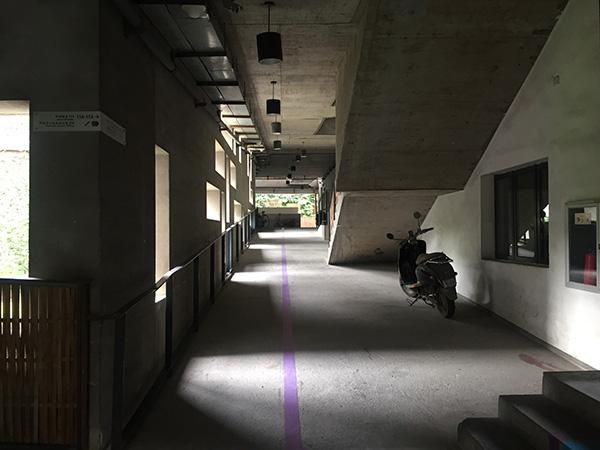 山南的建筑一层除了主路,还有一条水堤在主路与景观水面穿插而行。此外,还有一个连接教学楼的二层廊道,如果是雨天,内部这条流线正好是避雨路线。但是对初次到象山校园的人来说,由于每条道路的识别性差,楼号不明,很容易迷失方向,更别说在建筑内部穿行了。