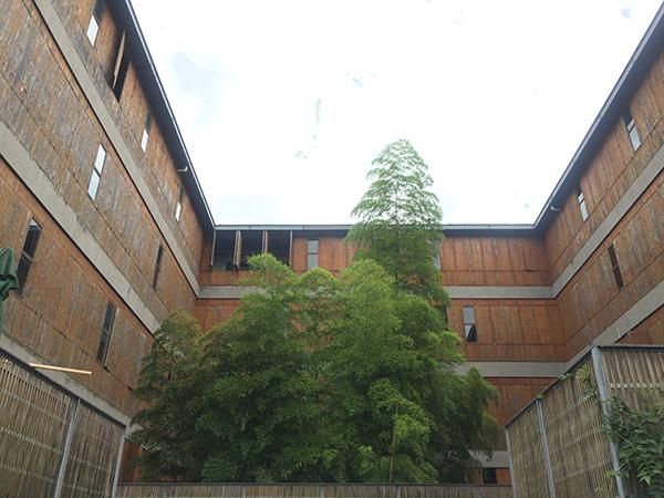 除了与外部山水的关系,几乎每栋楼里都有个庭院或者天井,教学楼的基本平面也是按照传统民居的三合、四合院的原型来布置,这些庭院有些筑了高台,高台上种棵银杏,站在院里需要抬头才能看到银杏的顶,庭院深深的空间让原本不高的建筑好像高了很多;有些庭院中间是下陷的,更像江南民居特有的氛围,连接教室的走廊高起一些,院内的铺砖便是从那些拆掉的村子里搬来的小青砖和瓦片。