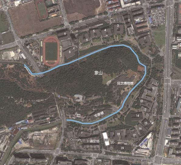 象山校园的山便是在学校中心的象山。校园里的所有楼都围着这一座山,沿着象山有一条水渠。