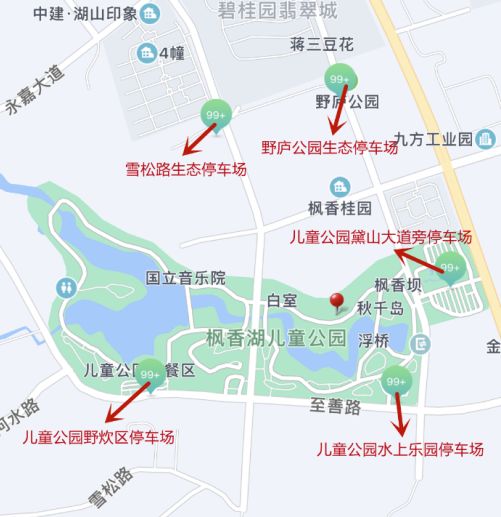 枫香湖儿童公园及周边共有5个停车场,停车位总计约1500个,预计13时左右儿童公园黛山大道旁停车场(停车位720个)、儿童公园野炊区停车场(停车位200个)、儿童公园水上乐园停车场(停车位180个)将达到饱和。待所有停车场达到饱和后,现场执勤警力将引导车辆有序停放在公园周边的河水路、至善路、雪松路、福顺大道。