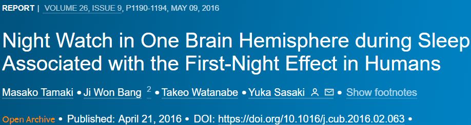 2016.04.21布朗大学(Brown University)的研究团队发表在生物学期刊《Current Biology》上的一项研究表明了:人在陌生的场所第一次睡觉时,一半的大脑会为了警惕危险而一直保持清醒状态。
