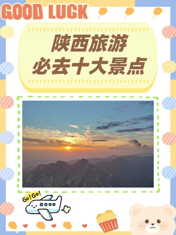 陕西旅游十大必去景点:华山、黄河壶口瀑布风景名胜区、秦始皇兵马俑博物馆、大雁塔·大唐芙蓉园景区、华清宫、法门寺、金丝峡景区、黄帝陵景区、茂陵博物馆、太白山。