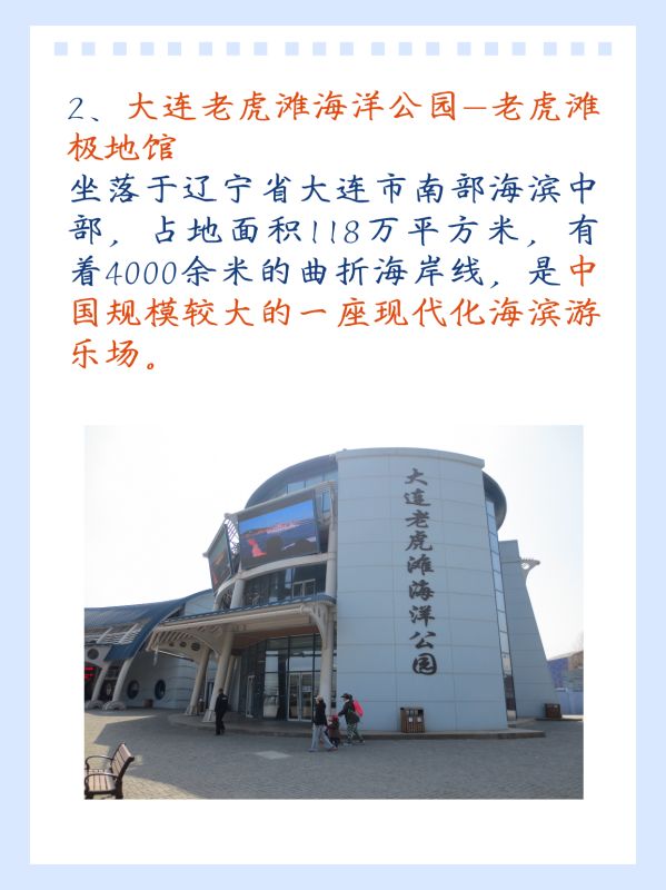 大连老虎滩海洋公园:老虎滩海洋公园是东北地区最大的海洋主题公园,可以观赏各种海洋生物和表演,适合全家出游。