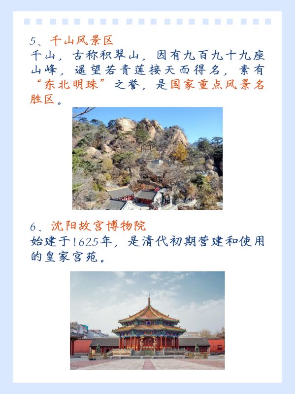 沈阳故宫:沈阳故宫是中国仅次于北京故宫的第二大皇家宫殿,建于清朝早期,具有极高的历史价值。