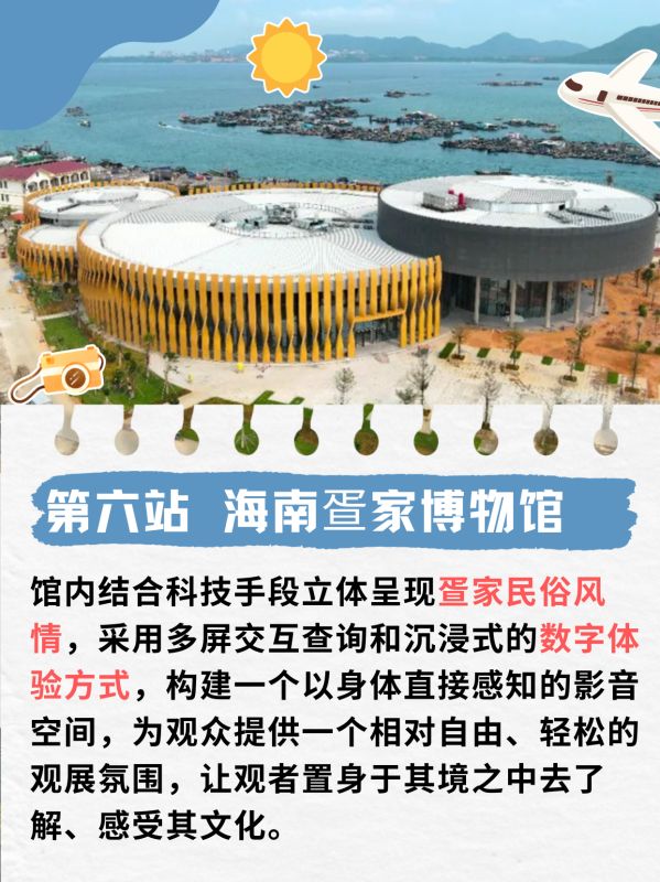 海南疍家博物馆坐落于陵水黎族自治县新村镇潟湖水岸,总占地面积约2万平方米,作为国内首个以疍家文化为主题的博物馆,是海南旅游的热门打卡点。馆内结合科技手段立体呈现疍家民俗风情,采用多屏交互查询和沉浸式的数字体验方式,构建一个以身体直接感知的影音空间,为观众提供一个相对自由、轻松的观展氛围,让观者置身于其境之中去了解、感受其文化。三大重磅艺术展免费开放,展览内聚集国内优秀青年艺术家,在绘画中与媒介方式上的实验与个性的表达,为观者带来视觉上的变化。