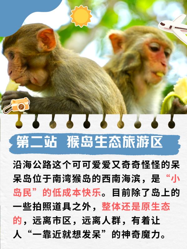 南湾猴岛是我国唯一的热带海岛型猕猴自然保护区,猴岛总面积约10.2平方公里,岛上拥有原始的自然风光和2000多只可爱的猕猴。跨越时间的河流,做一个只记得快乐的人。沿海公路这个可可爱爱又奇奇怪怪的呆呆岛位于南湾猴岛的西南海滨,是“小岛民”的低成本快乐。目前除了岛上的一些拍照道具之外,整体还是原生态的,远离市区,远离人群,有着让人“一靠近就想发呆”的神奇魔力。