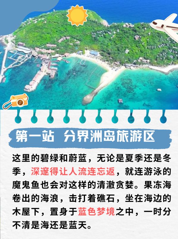 分界洲岛旅游区被称为浮在南海上的美丽遗世孤岛,岛上有明亮的海沙、湛蓝的大海以及热带原始岛屿特有地貌、稀有的海洋生物资源等。这里的碧绿和蔚蓝,无论是夏季还是冬季,深邃得让人流连忘返,就连游泳的魔鬼鱼也会对这样的清澈贪婪。果冻海卷出的海浪,击打着礁石,坐在海边的木屋下,置身于蓝色梦境之中,一时分不清是海还是蓝天。