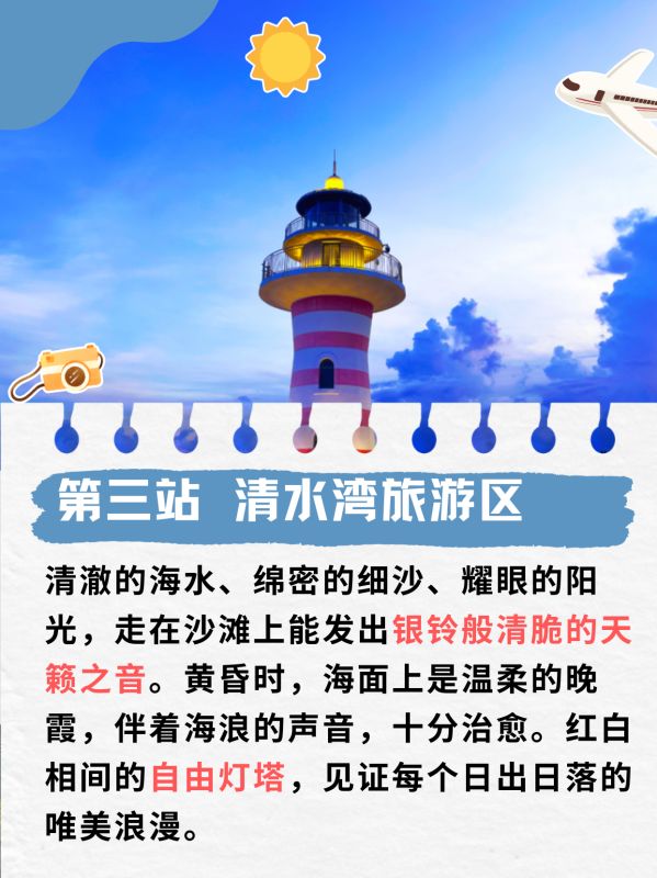 清澈的海水、绵密的细沙、耀眼的阳光在海岸弧形处,聚合成长达12公里的绵长海岸线,走在沙滩上能发出银铃般清脆的天籁之音。自由灯塔这里非常适合看海,看日出日落。黄昏时,海面上是温柔的晚霞,伴着海浪的声音,十分治愈。红白相间的自由灯塔,见证每个日出日落的唯美浪漫。雅居乐海上艺术中心附近可以看到清水湾游艇会,一艘艘游艇安静地窝在海湾一角,右边则是泰式超豪华别墅,景色优美,是清水湾“打卡圣地”之一,有兴趣的朋友还可以乘坐游艇出海,体验海钓、日光浴、游泳。