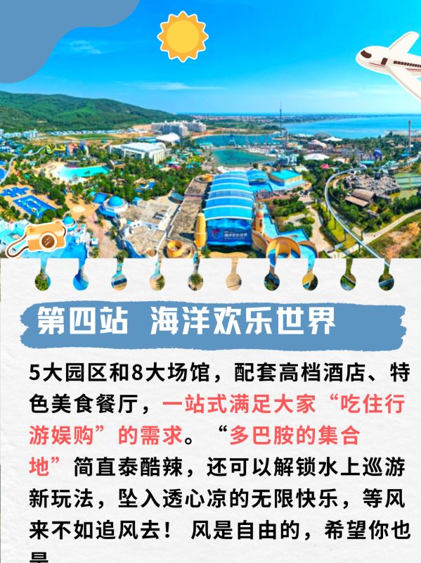 海南海洋欢乐世界度假区坐落于素有“珍珠海岸”之称的陵水黎安港畔,三面环海,精心打造5大园区(三沙之城、探索港湾、冒险海洋、生态海岸、水世界)、8大场馆,配套高档酒店、特色美食餐厅,一站式满足大家“吃、住、行、游、娱、购”的需求。“多巴胺的集合地”简直泰酷辣,在这里可以遍历惊险刺激,解锁水上巡游新玩法,坠入透心凉的无限快乐,等风来不如追风去! 风是自由的,希望你也是。