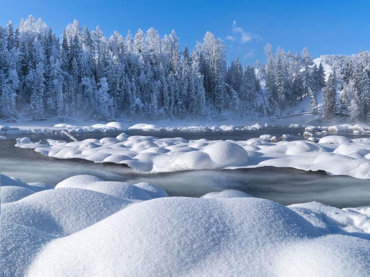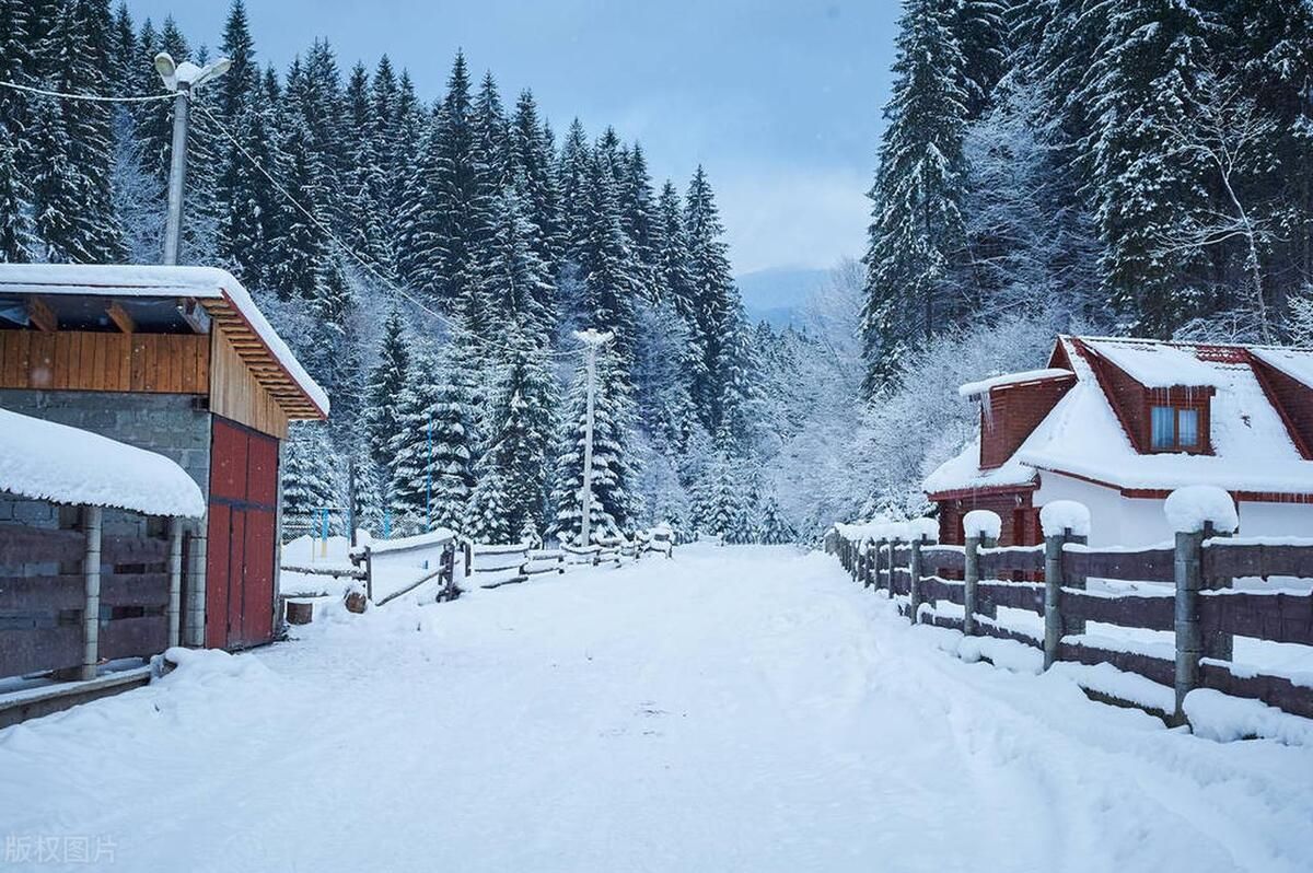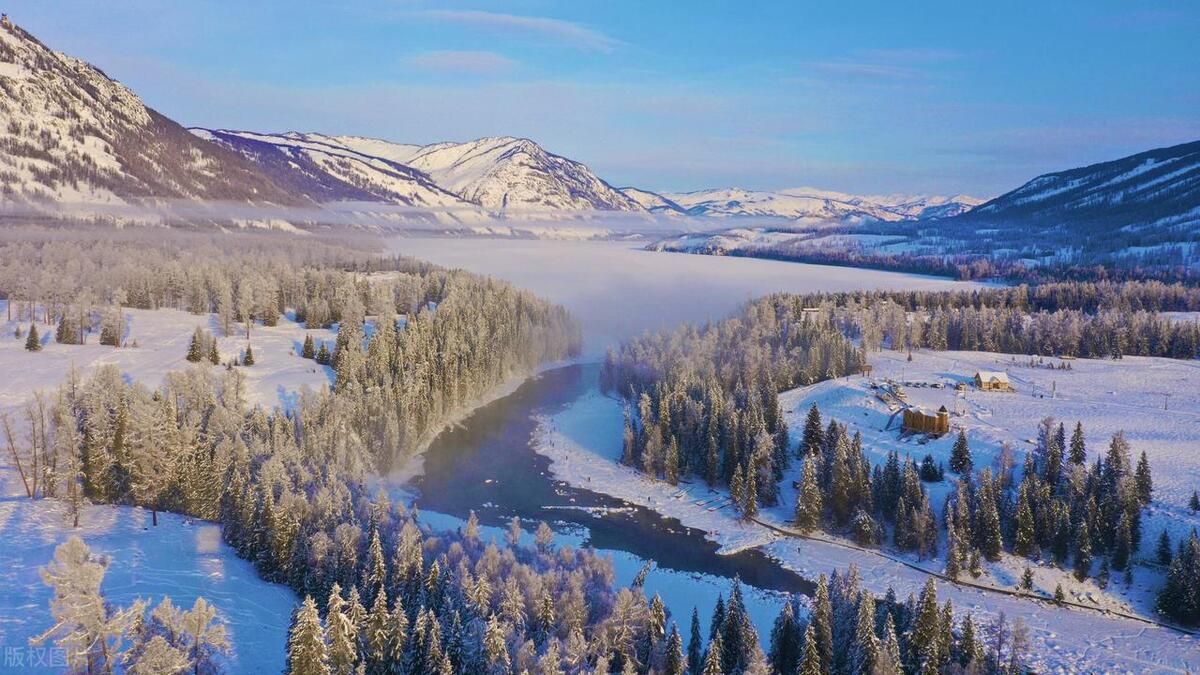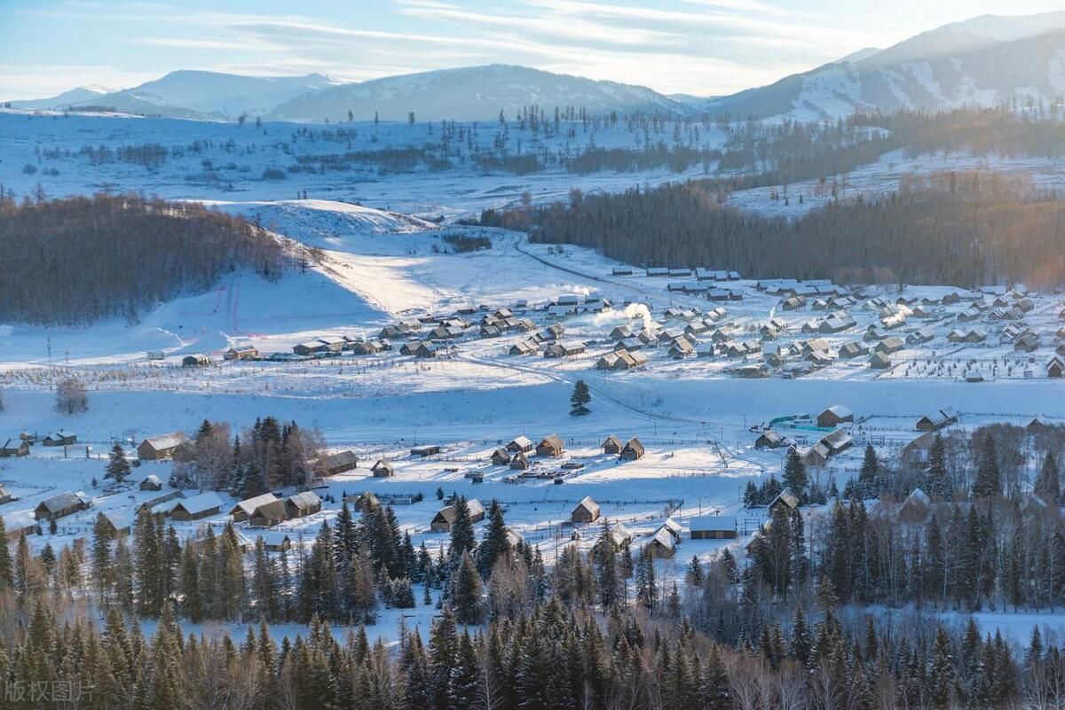 喀纳斯,被皑皑白雪覆盖,银装素裹,就像是一个美到窒息的童话世界,有一望无际的林海雪原,有湛蓝清澈的湖泊,也有升起袅袅炊烟的小木屋,在朦胧的晨雾中,每一处都美得梦幻又惊艳!
