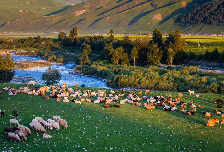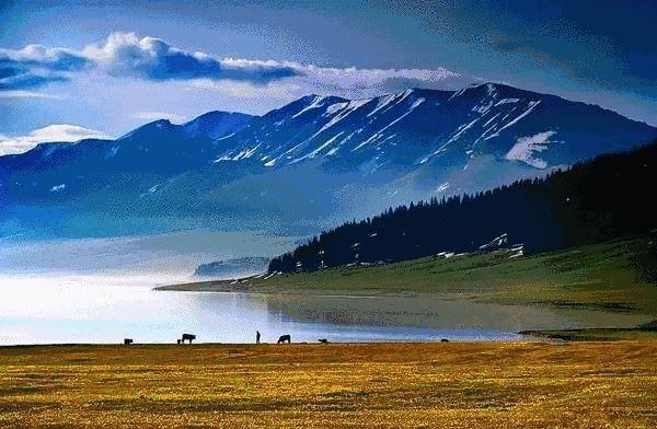 每到5月,湖畔林茂涧清,草茂花繁,辽阔的草原上,幕帐点点,炊烟袅袅,牛羊成群,牧马奔驰,构成了一幅动人的牧场风景画。