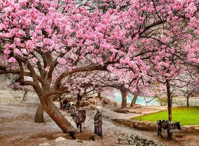 每年的3月底4月初这里积雪初融,土地增温,一个杏花掩映的村庄出现在你的面前,杏花朦朦胧胧,如烟似雾,好像是一片粉红的祥云飘落在河谷之中。