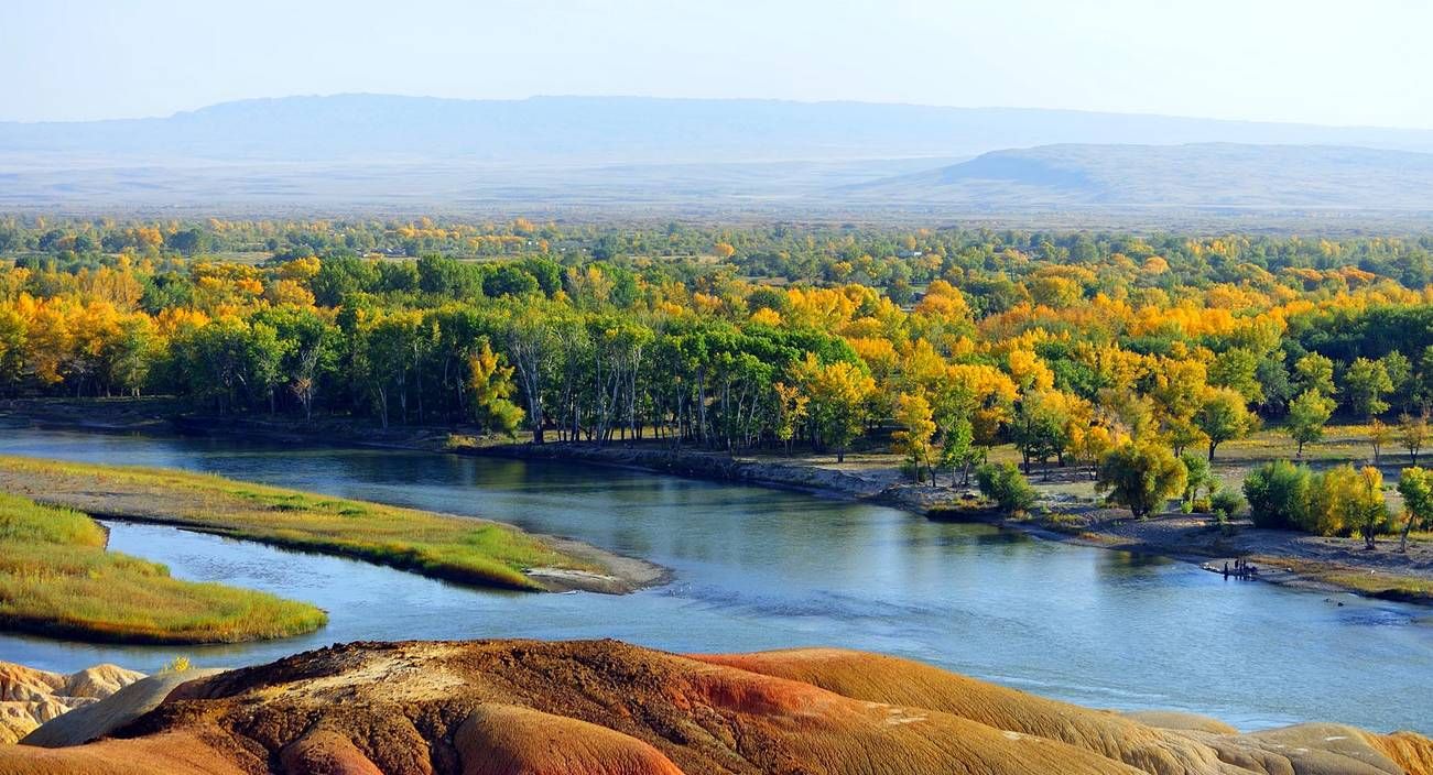 她毗邻碧波荡漾的额尔齐斯河,与对岸葱郁青翠的河谷风光遥相辉映,可谓"一河隔两岸,自有两重天"。