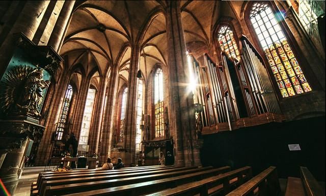 圣劳伦茨教堂(St.Lorenzkirche)始建于1270年,竣工于1477年,这座教堂原先是一座古罗马长方形的教堂,之后融入了哥特式的风格,两座高塔就是最好的佐证。高塔间嵌入了一扇巨大的圆形花窗,直径达到9米。