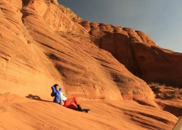 3、穿过玻璃栈道,就是特色火焰丹霞地貌了。到谷底时有浅滩可以玩水,水清、沙细,小朋友玩的都不想走了。