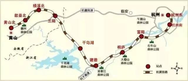 杭黄铁路全长265公里,其中浙江段185公里,设计时速为250公里每小时,全线共设10个站点,分别是杭州东、杭州南、富阳、桐庐、建德东、千岛湖、三阳、绩溪北、歙县北、黄山北。