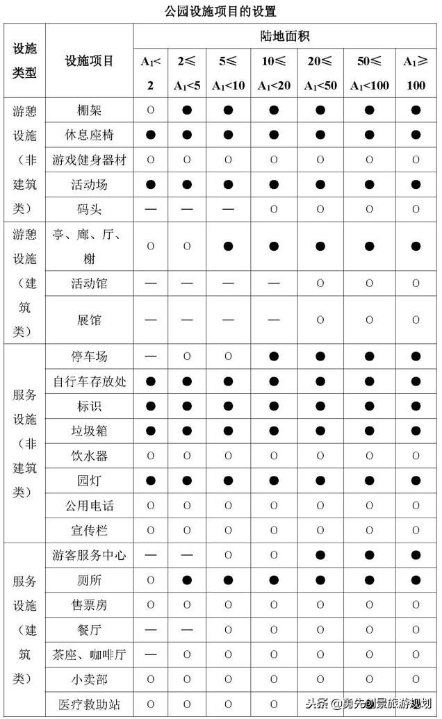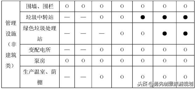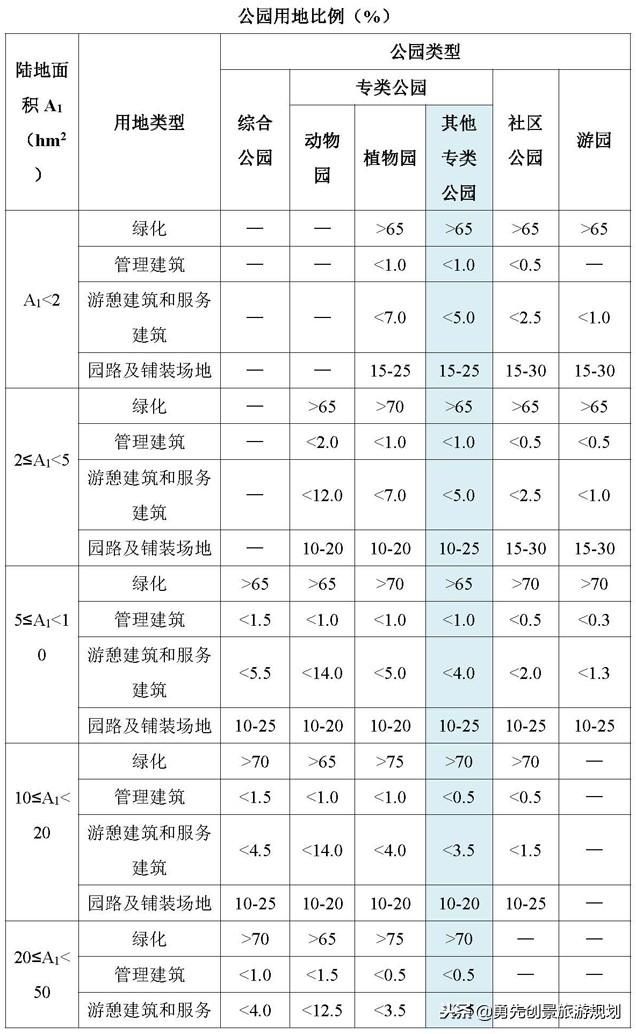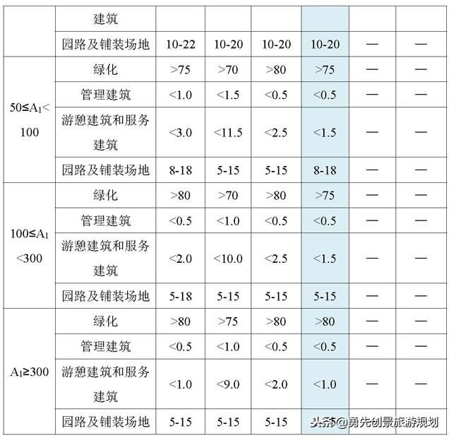 注:“—”表示不作规定;上表中管理建筑、游憩建筑和服务建筑的用地比例是指其建筑占地面积的比例。