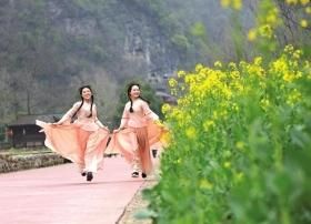 2月17日,湖南张家界,游人在武陵源黄龙洞景区的油菜花间游玩。图/视觉中国