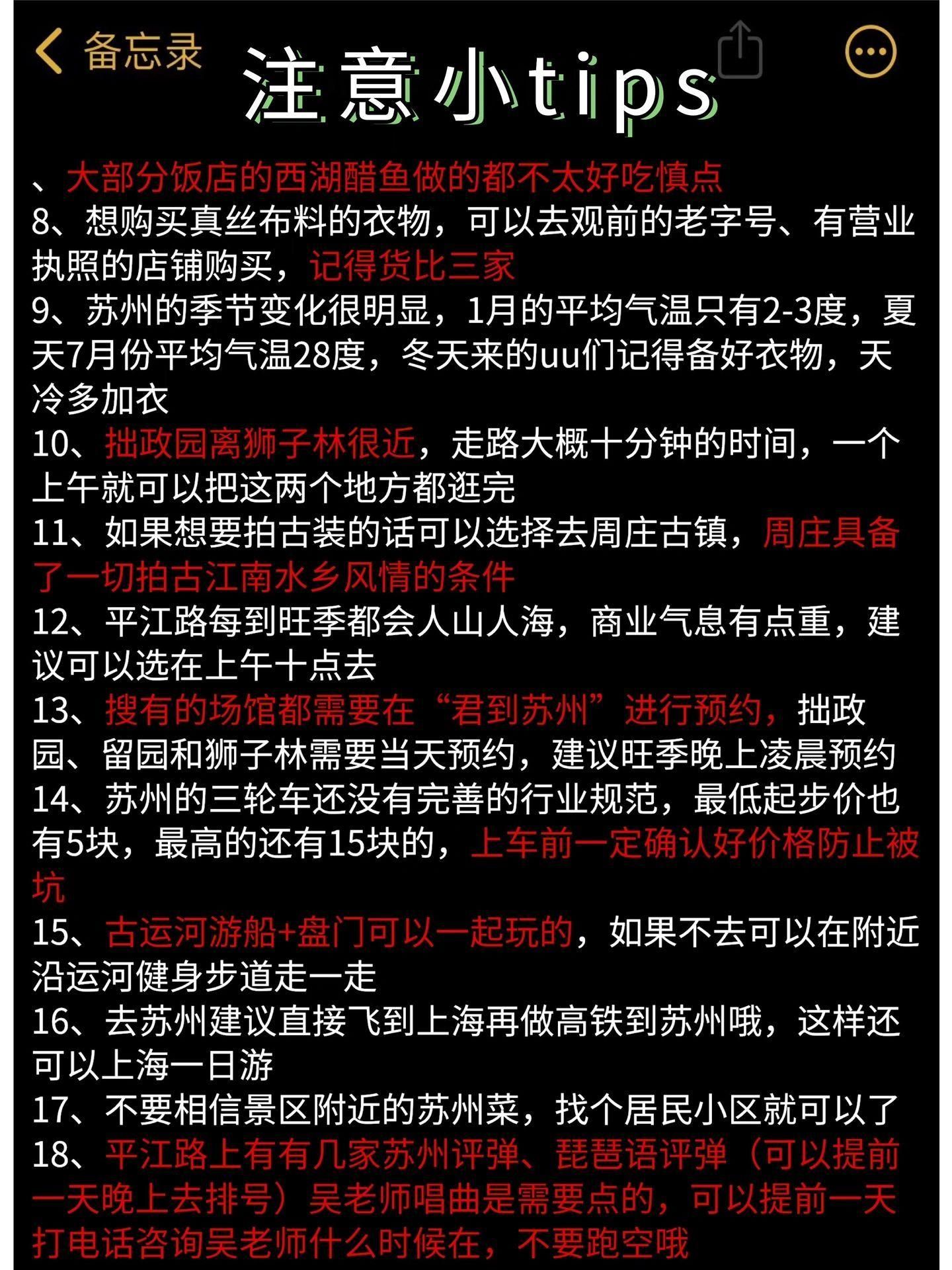 ✅路线推荐:第一天:拙政园 - 一狮子林 - 一苏州博物馆 - 一诚品书店 - 一金鸡湖看日落 - 一去听评弹第二天:西园寺吃素面 - 一十全街 - 一留园 - 一七塘街夜景 + 手绘书签第三天:虎丘 - 一双塔集市 - 一东官上点