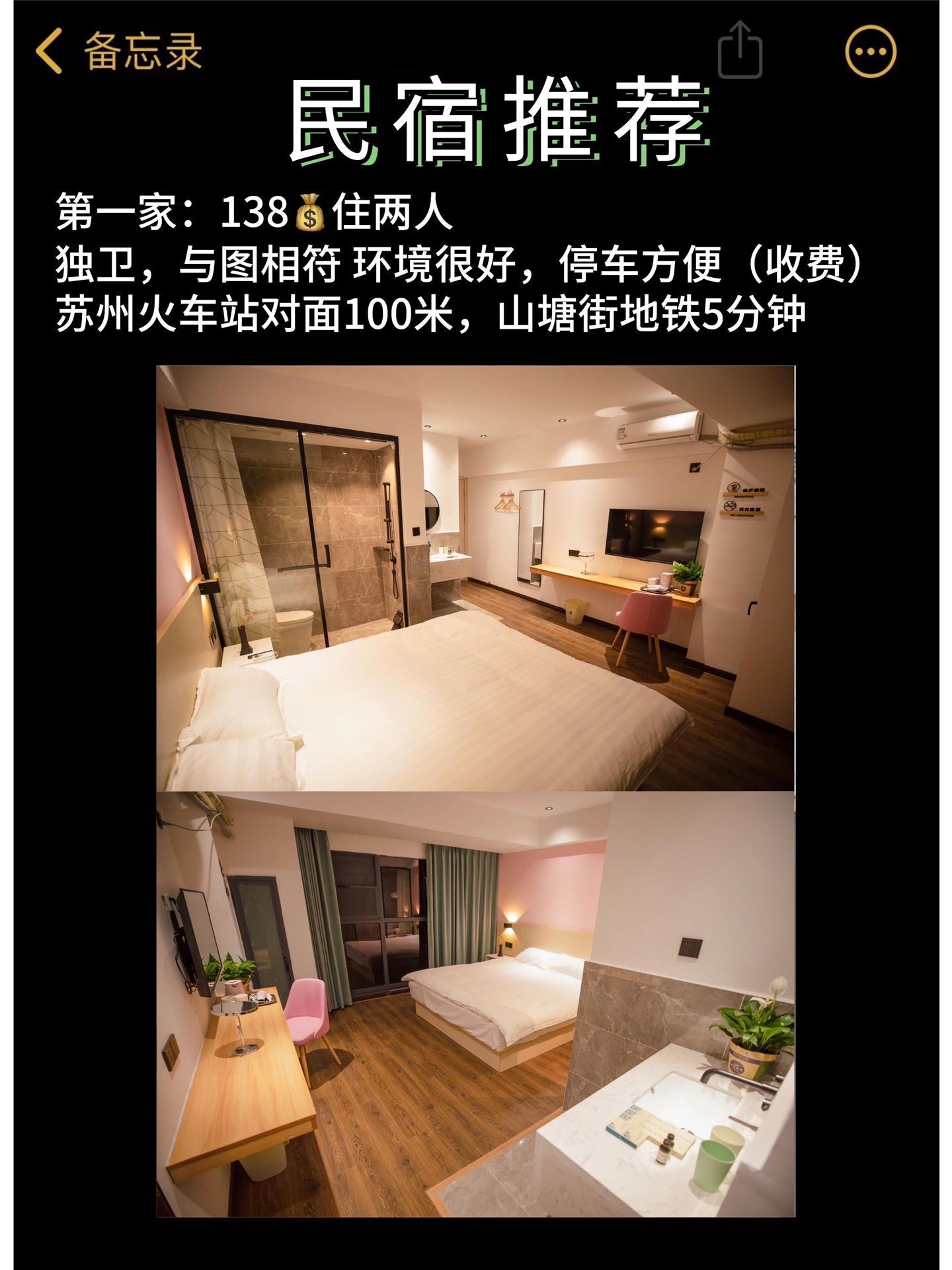 ✅住宿推荐:1️⃣ 第一家:价格:138元,适合两人入住特点:有独立卫生间,环境很好,停车方便(收费),距离苏州火车站对面100米,离山塘街地铁站步行5分钟。2️⃣ 第二家:价格:240元,适合四人入住特点:有投影仪和大床房,可以观赏美景,还可自己做饭,有密码锁。距离山塘街石路步行街商圈、拙政园和狮子林等景点很近。
