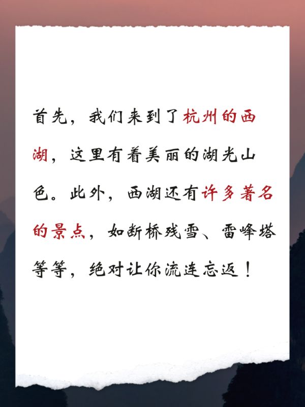 - 西湖:是杭州的著名景点,以其美丽的湖光山色而闻名于世,是游客必游之地。