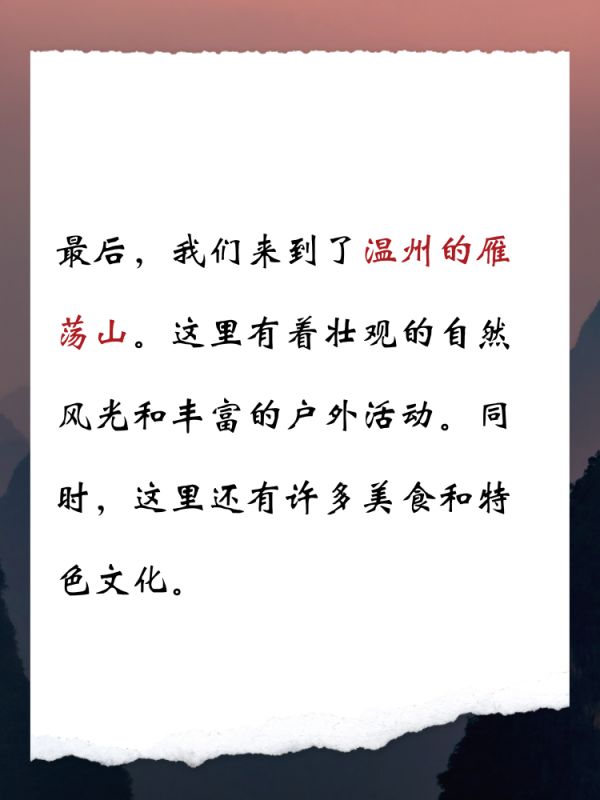 最后,我们来到了温州的雁荡山。这里有着壮观的自然风光和丰富的户外活动。你可以爬山、观景、野营,享受户外运动的乐趣。同时,这里还有许多美食和特色文化,绝对是一个让你流连忘返的地方!