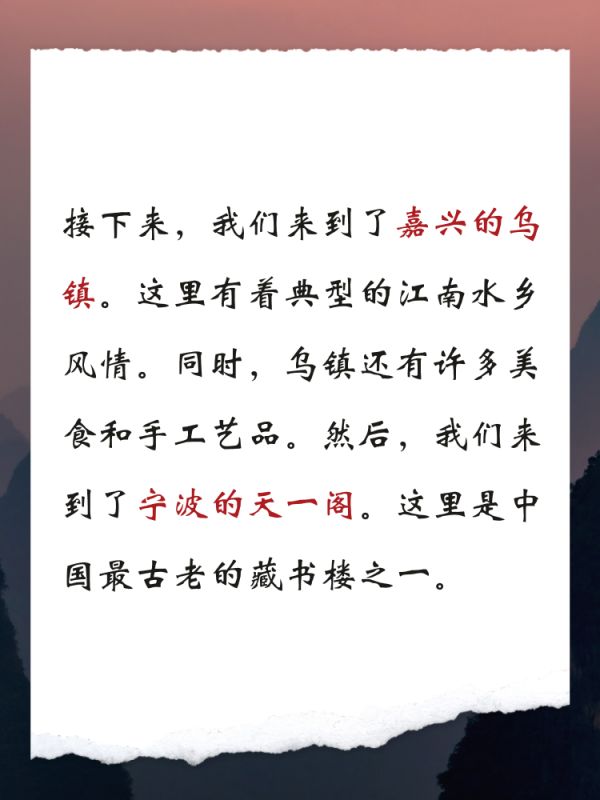 接下来,我们来到了嘉兴的乌镇。这里有着典型的江南水乡风情。你可以乘坐木船游览古镇,欣赏那些古色古香的建筑和风景。同时,乌镇还有许多美食和手工艺品,绝对是一个值得一游的地方!