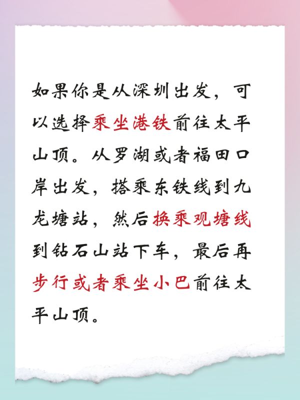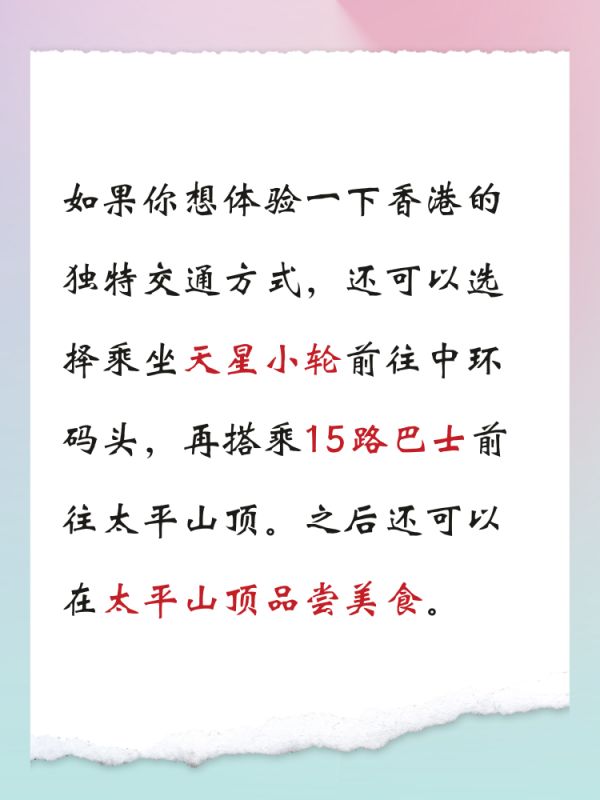 接下来,我们来说说交通攻略。如果你是从深圳出发,可以选择乘坐港铁前往太平山顶。从罗湖或者福田口岸出发,搭乘东铁线到九龙塘站,然后换乘观塘线到钻石山站下车,最后再步行或者乘坐小巴前往太平山顶。另外,如果你想体验一下香港的独特交通方式,还可以选择乘坐天星小轮前往中环码头,再搭乘15路巴士前往太平山顶。