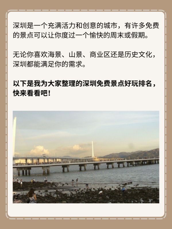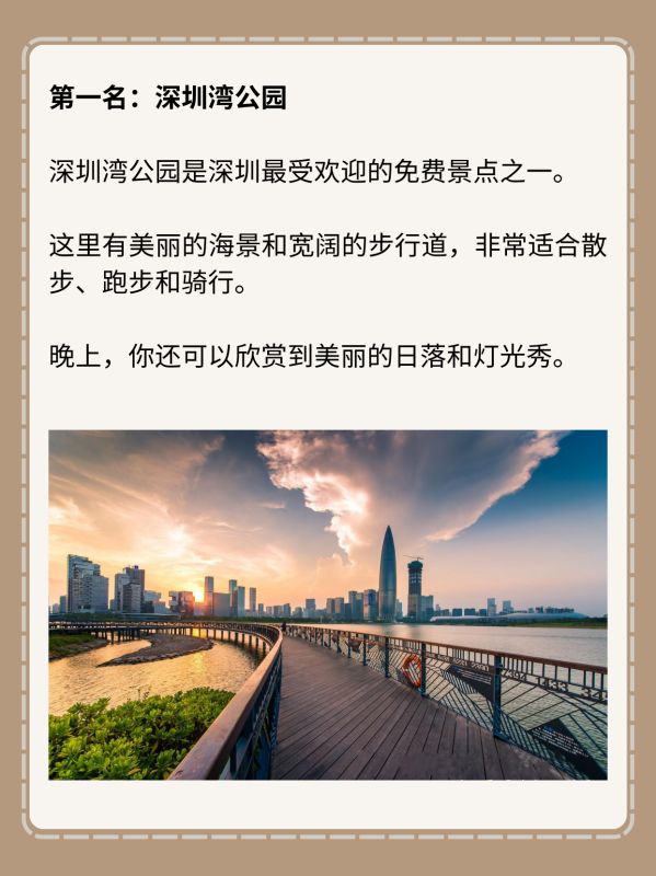 深圳是一个充满活力和创意的城市,有许多免费的景点可以让你度过一个愉快的周末或假期。