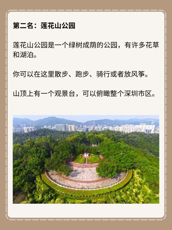 莲花山公园是一个绿树成荫的公园,有许多花草和湖泊。