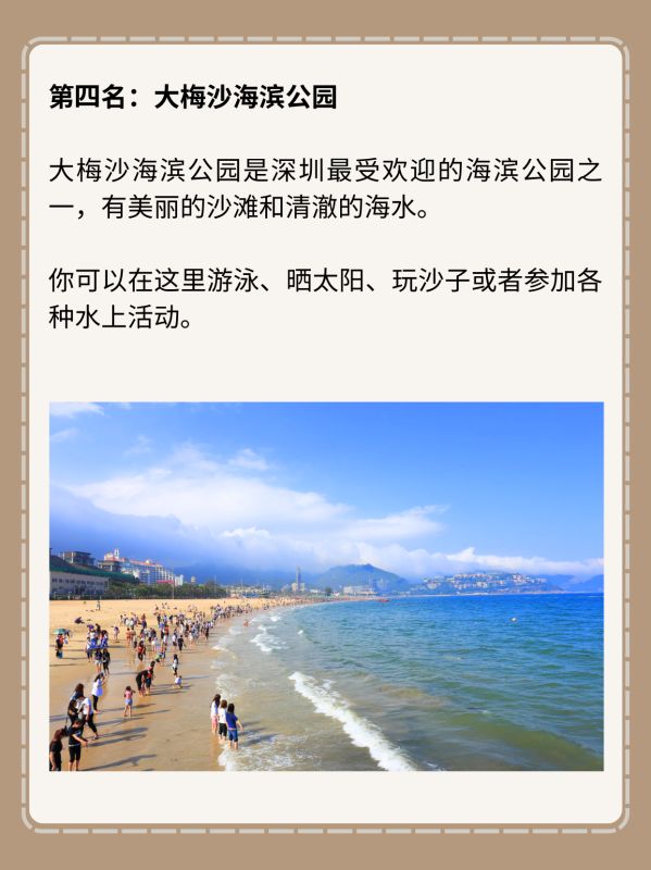 3、小梅沙:小梅沙位于深圳特区东部大鹏湾畔,距市中心区30公里,是深圳市十大旅游景点之一,深圳市最大的海滨度假胜地。小梅沙依山傍海,周围是一片热带雨林景区,洁白的沙滩一望无际,与香港遥遥相对。新落成的海洋世界里,每天都有海豚、海狮、海豹的精彩表演,令人眼界大开。
