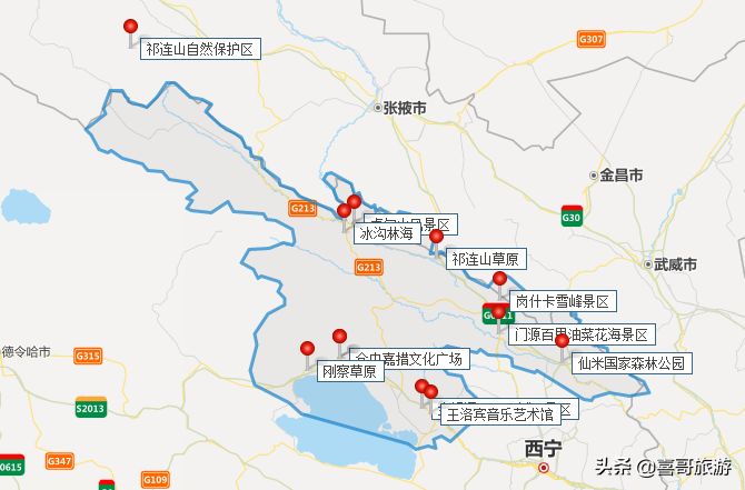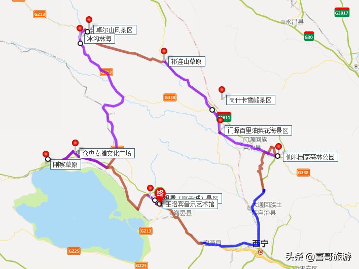 2、青海海北十大景点自驾游行程路线:青海海北西海镇-王洛宾音乐艺术馆-金银滩(原子城)景区-仓央嘉措文化广场-刚察草原-冰沟林海-卓尔山风景区-祁连山草原-岗什卡雪峰-门源百里油菜花海-仙米国家森林公园-青海海北西海镇。