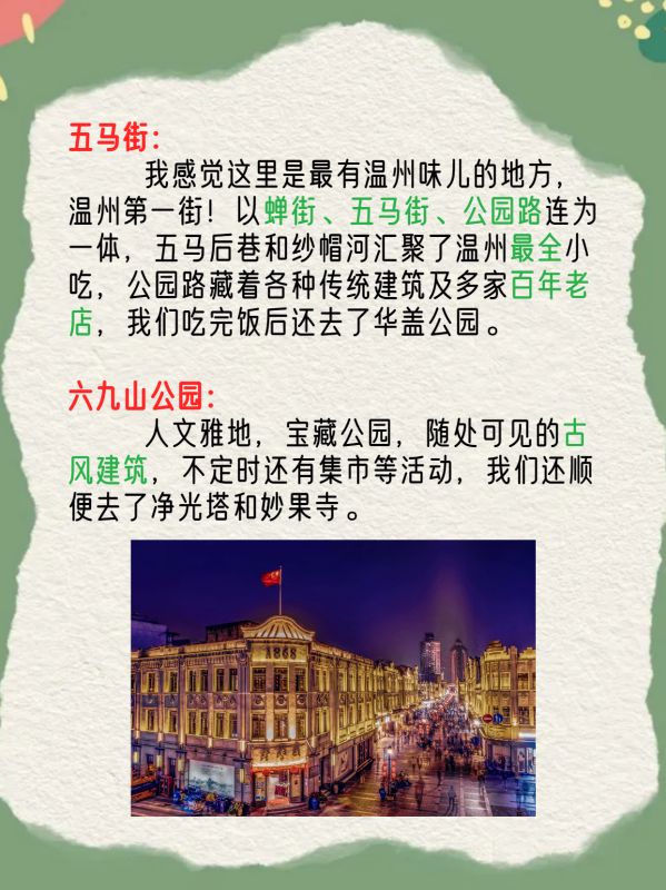 我感觉这里是最有温州味儿的地方,温州第一街!以蝉街、五马街、公园路连为一体,五马后巷和纱帽河汇聚了温州最全小吃,公园路藏着各种传统建筑及多家百年老店,我们吃完饭后还去了华盖公园。