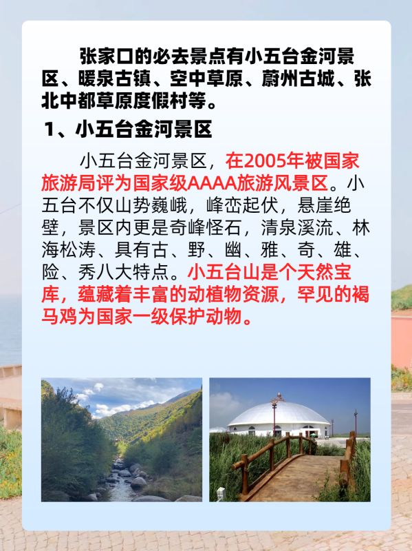 张家口的必去景点有小五台金河景区、暖泉古镇、空中草原、蔚州古城、张北中都草原度假村等。