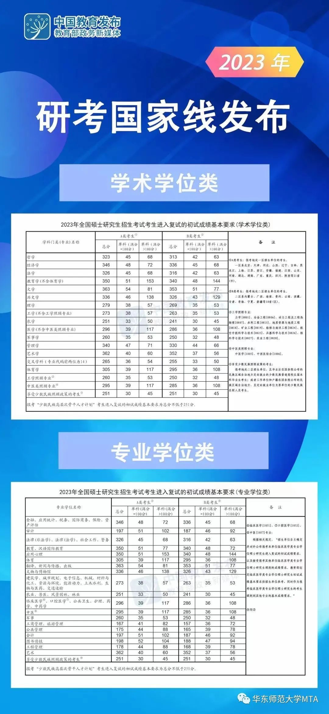 1.考生参加2023年全国管理类联考(MTA/MBA/MPA/MPAcc/MEM等)且成绩可以达到2023年所报考项目的国家东部线(2023年MTA项目国家线:总分≥167、外语≥41、综合≥82,若一志愿是其他专业,则需要达到报考一志愿专业国家线才可具备调剂资格。若最终有调剂名额华东师范大学最低调剂录取分数线仍以国家线为最低标准,低于国家线无法调剂);