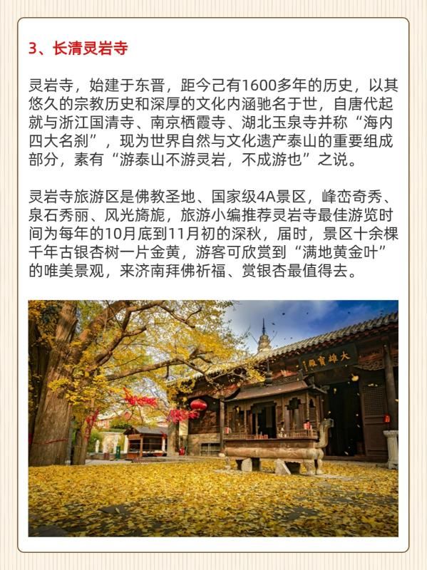 灵岩寺旅游区是佛教圣地、国家级4A景区,峰峦奇秀、泉石秀丽、风光旖旎,旅游小编推荐灵岩寺最佳游览时间为每年的10月底到11月初的深秋,届时,景区十余棵千年古银杏树一片金黄,游客可欣赏到“满地黄金叶”的唯美景观,来济南拜佛祈福、赏银杏最值得去。