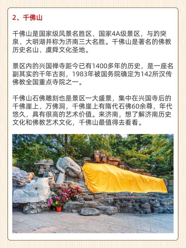 千佛山是国家级风景名胜区、国家4A级景区,与趵突泉、大明湖并称为济南三大名胜。千佛山是著名的佛教历史名山、虞舜文化圣地。