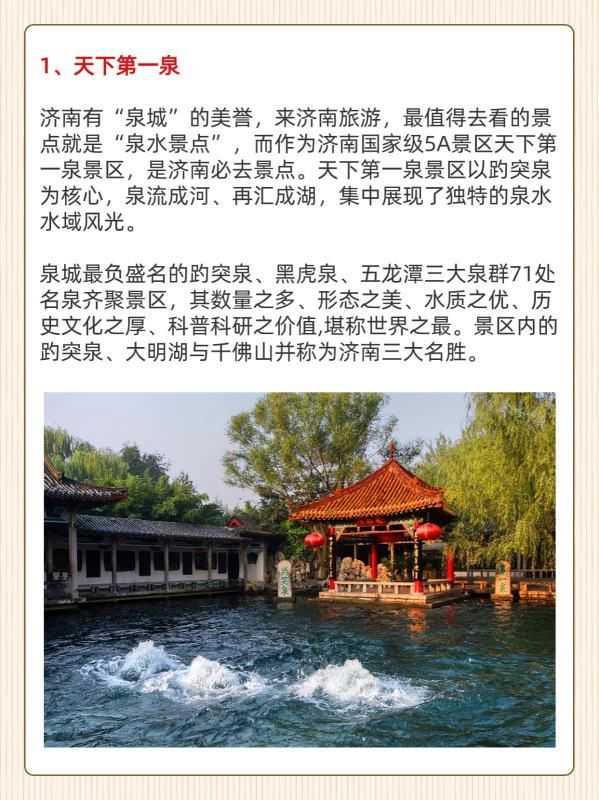 济南有“泉城”的美誉,来济南旅游,最值得去看的景点就是“泉水景点”,而作为济南国家级5A景区天下第一泉景区,是济南必去景点。天下第一泉景区以趵突泉为核心,泉流成河、再汇成湖,集中展现了独特的泉水水域风光。