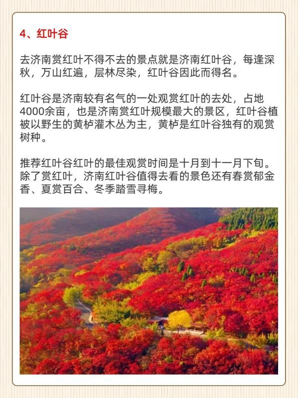推荐红叶谷红叶的最佳观赏时间是十月到十一月下旬。除了赏红叶,济南红叶谷值得去看的景色还有春赏郁金香、夏赏百合、冬季踏雪寻梅。