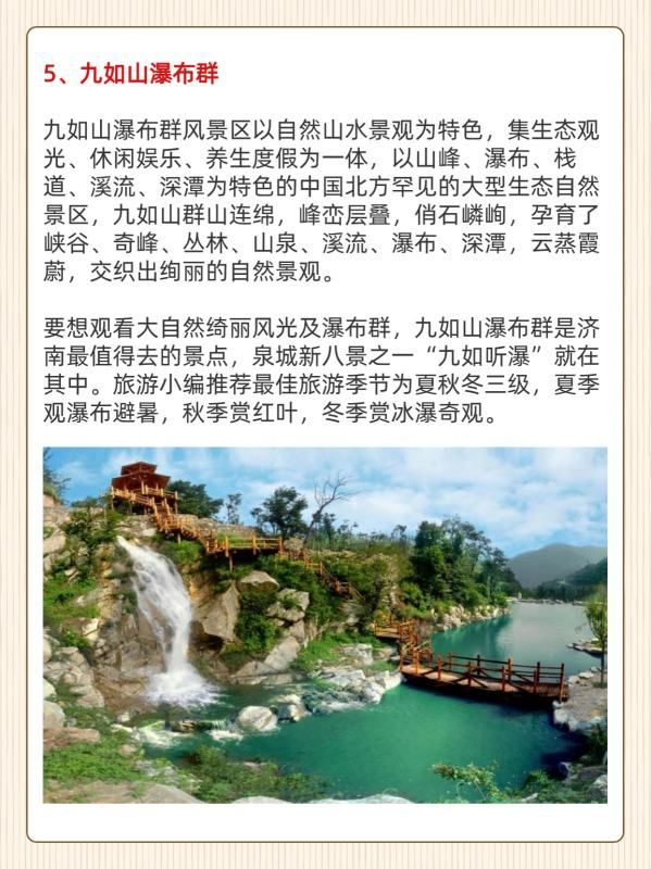 要想观看大自然绮丽风光及瀑布群,九如山瀑布群是济南最值得去的景点,泉城新八景之一“九如听瀑”就在其中。旅游小编推荐最佳旅游季节为夏秋冬三级,夏季观瀑布避暑,秋季赏红叶,冬季赏冰瀑奇观。
