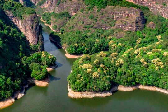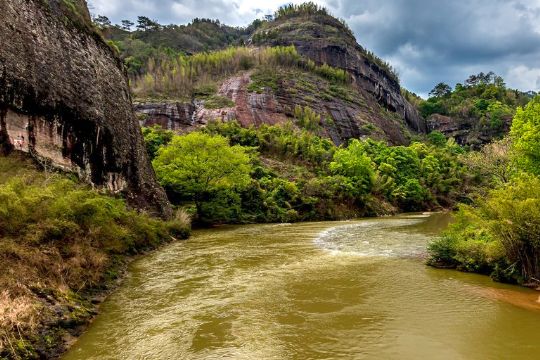 武夷山,地处于福建省北部,国家五A级景区,世界文化与自然双遗产,以丹霞地貌著称于世,尤其是九曲溪沿岸,奇峰和峭壁,映衬着清澈的河水,构成一幅奇妙秀美的杰出景观,而游览武夷山最大的看点,就是乘坐竹筏,畅游九曲溪,之后攀登天游峰。