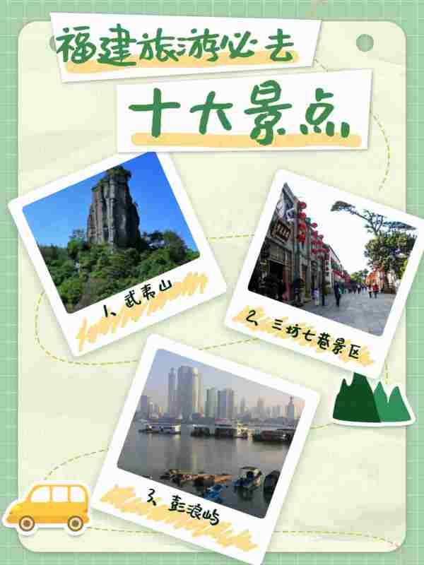 福建旅游必去景点推荐为:武夷山风景名胜区、福建土楼旅游区、鼓浪屿风景名胜区、福建三巷七坊、泰宁丹霞旅游区。