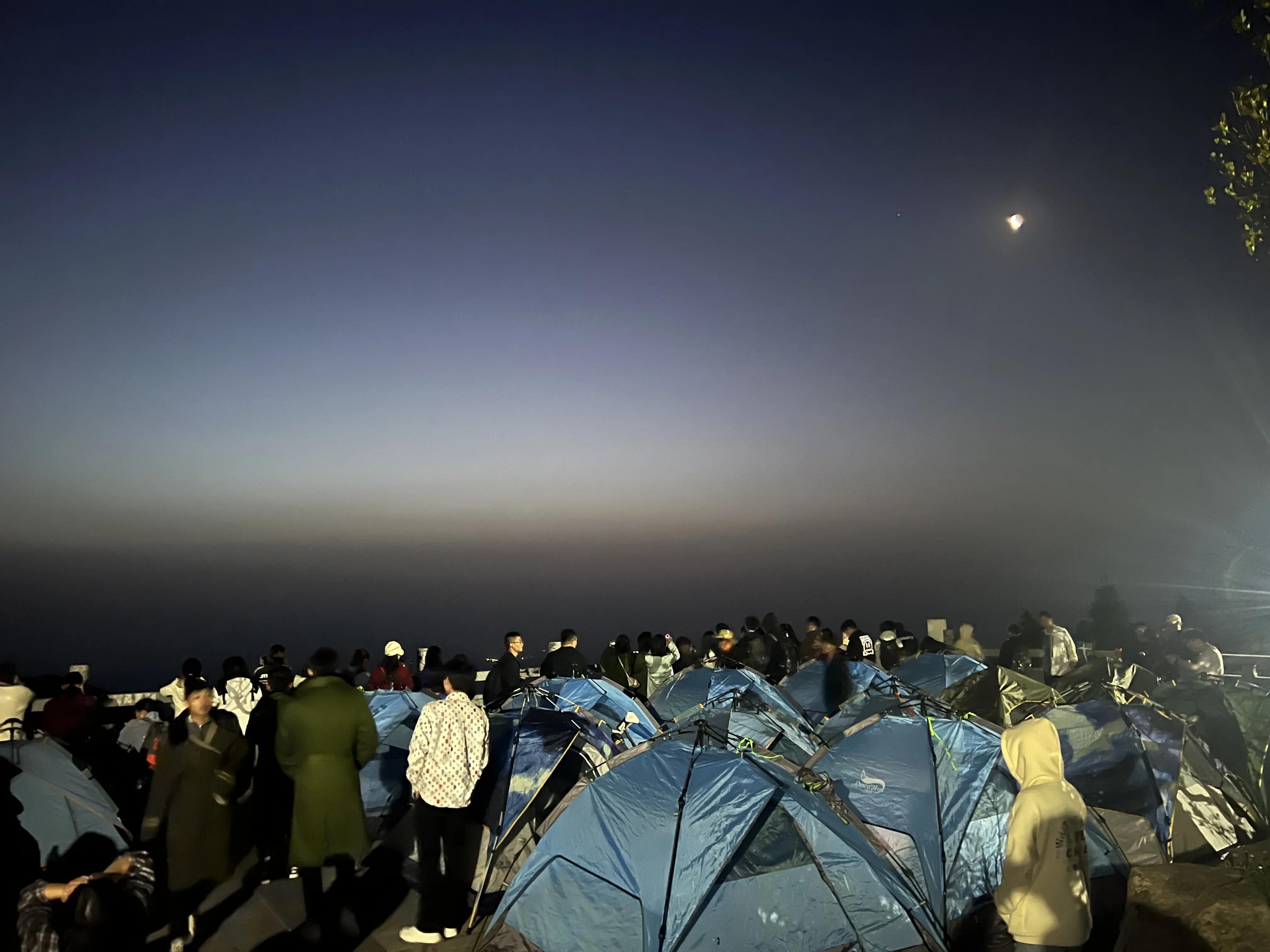 在凌晨5点左右,我们终于到达最佳日出观看点-观日台,上面已经布满了帐篷。我们的体力跟精神都快到极限了。朋友席地而坐,立马靠着我的肩膀眯上了。今天的日出是在6点05分出来。拿出手机,进入王者荣耀,只能靠它来祛除困意了。