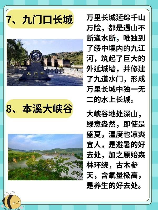 8、本溪大峡谷:大峡谷地处深山,绿意盎然,即使是盛夏,温度也凉爽宜人,是避暑的好去处,加之原始森林环绕,古木参天,含氧量极高,是养生的好去处。