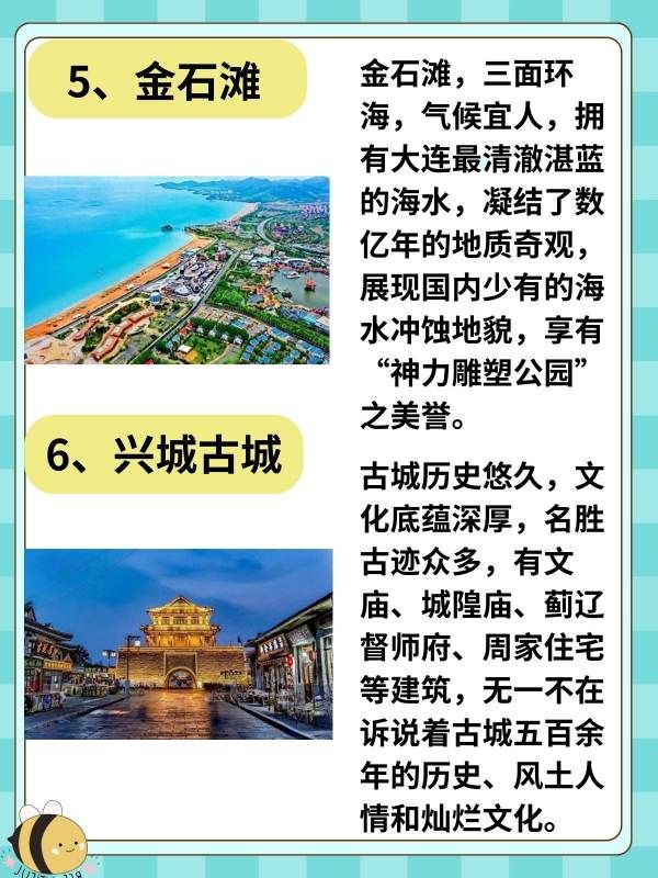 6、兴城古城:古城历史悠久,文化底蕴深厚,名胜古迹众多,有文庙、城隍庙、蓟辽督师府、周家住宅等建筑,无一不在诉说着古城五百余年的历史、风土人情和灿烂文化。