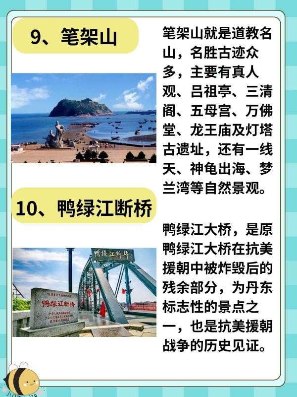 10、鸭绿江断桥:鸭绿江断桥,是原鸭绿江大桥在抗美援朝中被炸毁后的残余部分,为丹东标志性的景点之一,也是抗美援朝战争的历史见证。