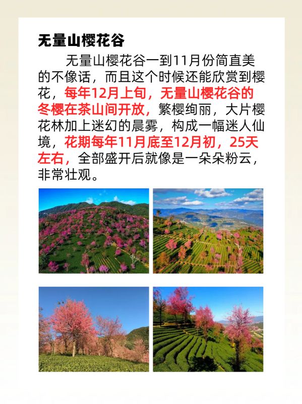 无量山樱花谷一到11月份简直美的不像话,而且这个时候还能欣赏到樱花,每年12月上旬,无量山樱花谷的冬樱在茶山间开放,繁樱绚丽,大片樱花林加上迷幻的晨雾,构成一幅迷人仙境,花期每年11月底至12月初,25天左右,全部盛开后就像是一朵朵粉云,非常壮观。