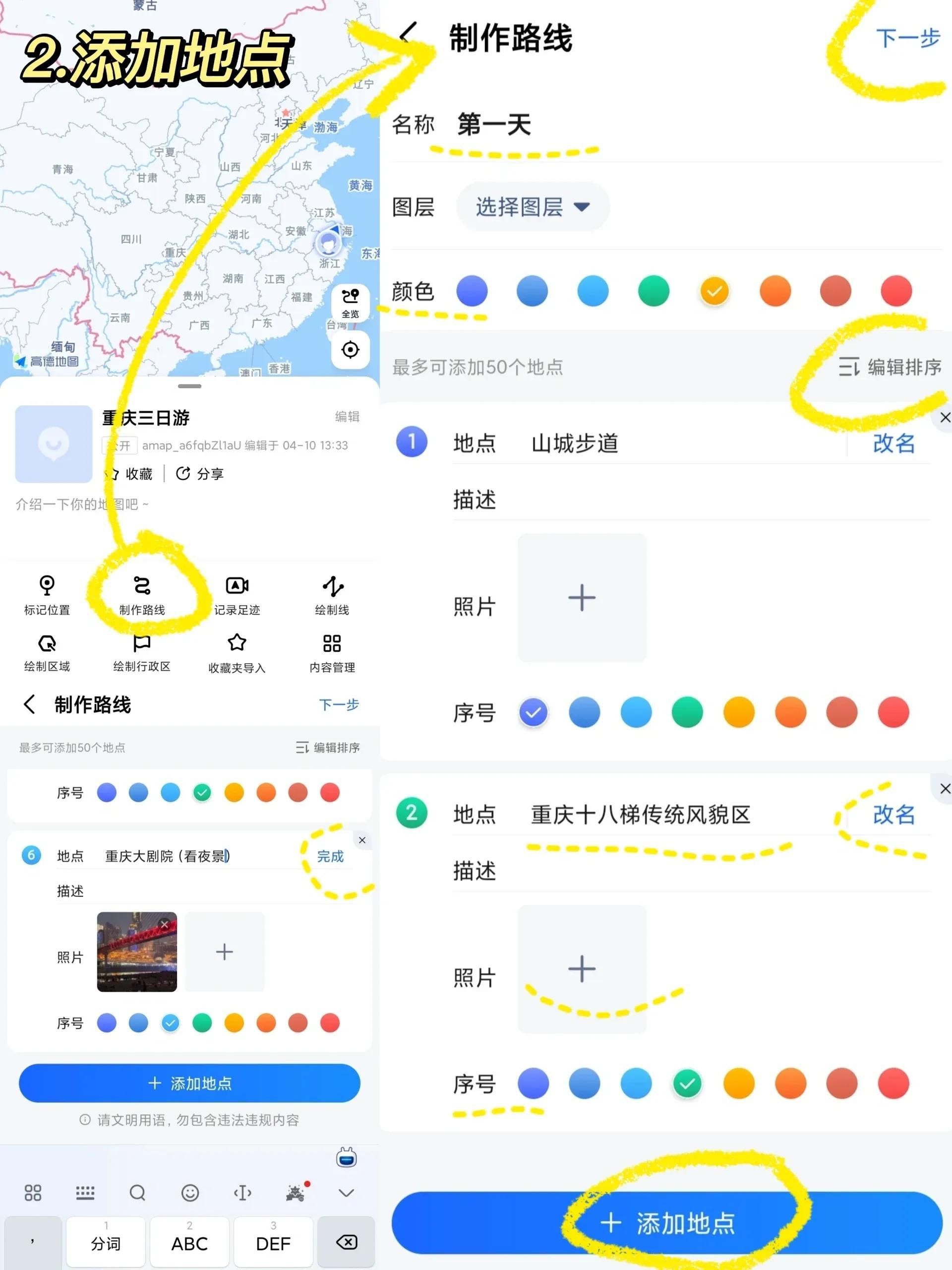 2.选择途经点。点击【制作路线】,最上面可以填路线名称和路线颜色,初始页面只有一个地点,点下面【添加地点】可以继续添加,最多五十个。每个地点都可以改名(改简称别称或者加备注)也可以添加相册照片和选择序号的颜色。点【编辑排序】可以按自己的想法调整顺序(下面有个顺路排序是高德智能规划路径排序)。都好了后点击【下一步】。
