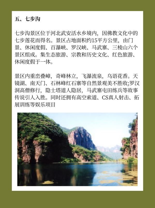七步沟景区位于河北武安活水乡境内,因佛教文化中的七步莲花而得名。景区占地面积约15平方公里,由门景、休闲度假、百瀑峡、罗汉峡、马武寨、三棱山六个景区组成。集生态旅游、宗教和历史文化、红色旅游、休闲度假于一体。