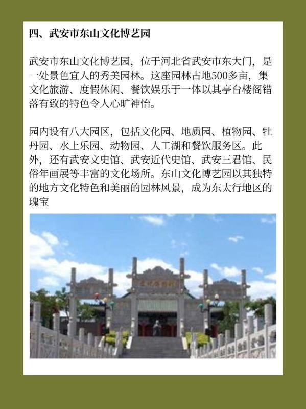 武安市东山文化博艺园,位于河北省武安市东大门,是一处景色宜人的秀美园林。这座园林占地500多亩,集文化旅游、度假休闲、餐饮娱乐于一体以其亭台楼阁错落有致的特色令人心旷神怡。